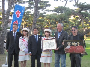ダンロップフェニックストーナメント開幕前の11月19日、より良き宮崎牛づくり対策協議会よりザ・レジェンド・チャリティ・プロアマ トーナメント実行委員会へ口蹄疫復興義援金への感謝と宮崎牛PR支援に感謝し、感謝状を贈呈しました。