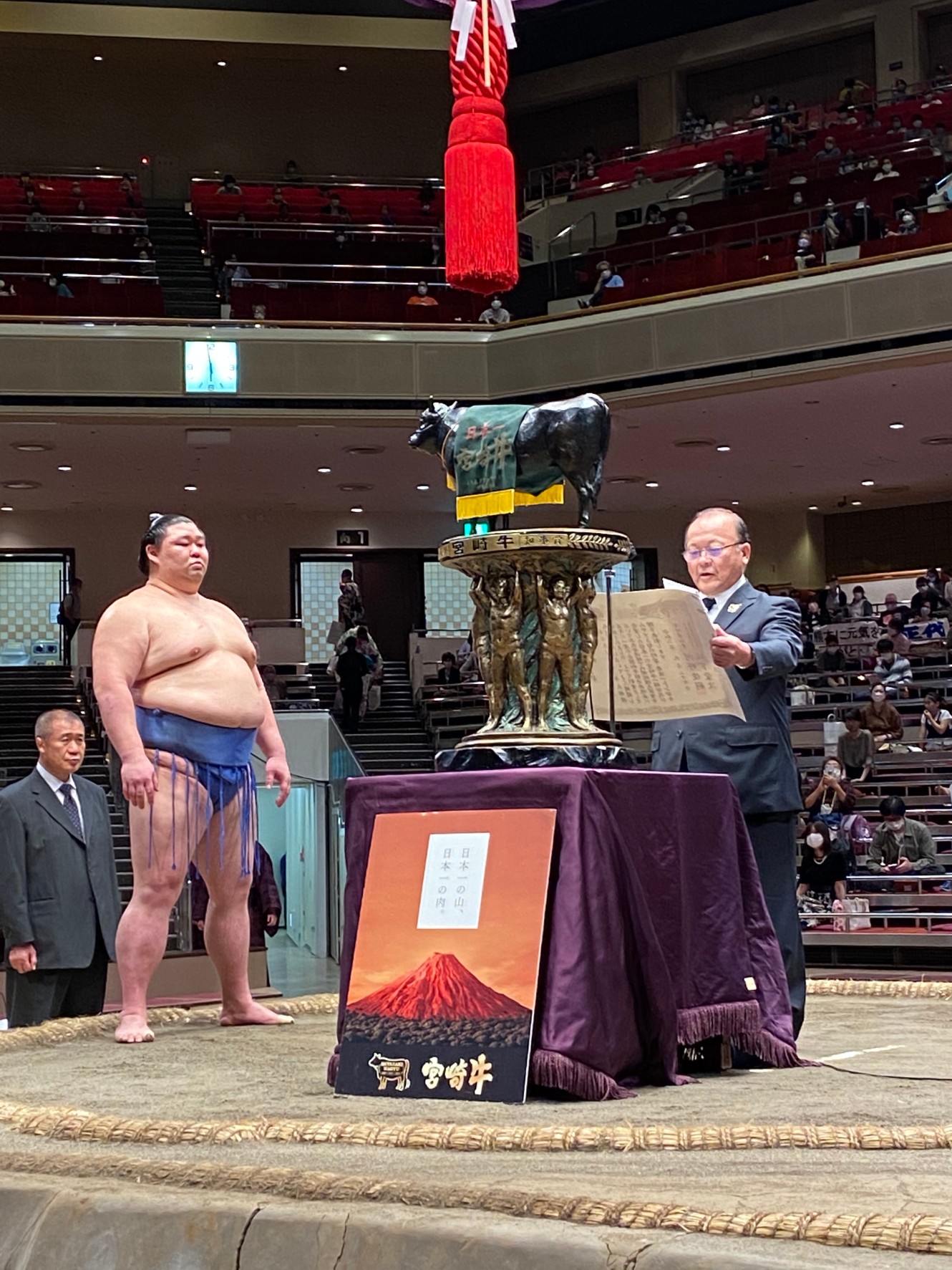 大相撲9月場所で優勝した正代関に宮崎牛1頭分と、宮崎の旬の野菜果物1トンが贈呈されました。