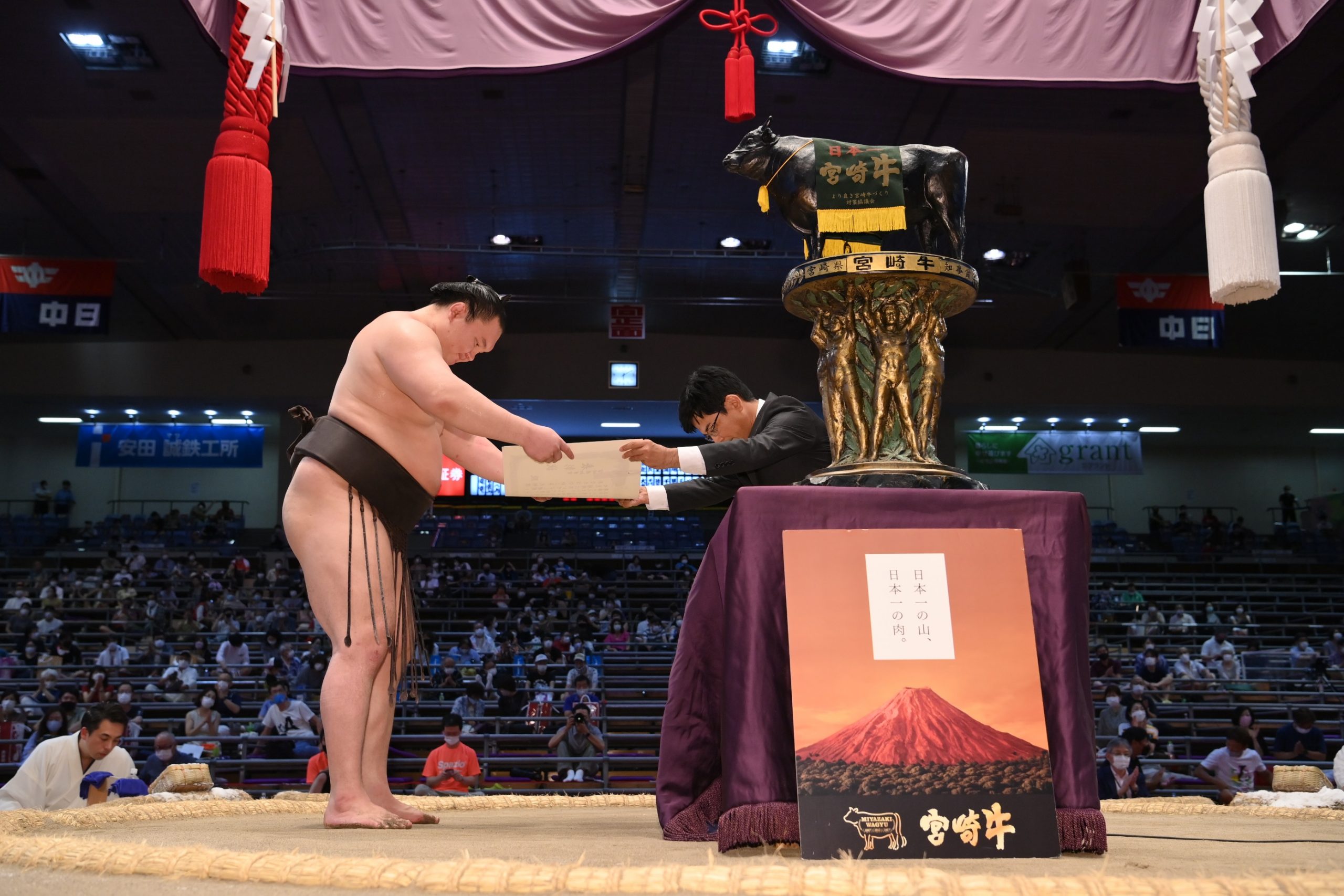 大相撲7月場所で優勝した横綱白鵬に宮崎牛1頭分と、宮崎の旬の野菜果物1トンが贈呈されました。